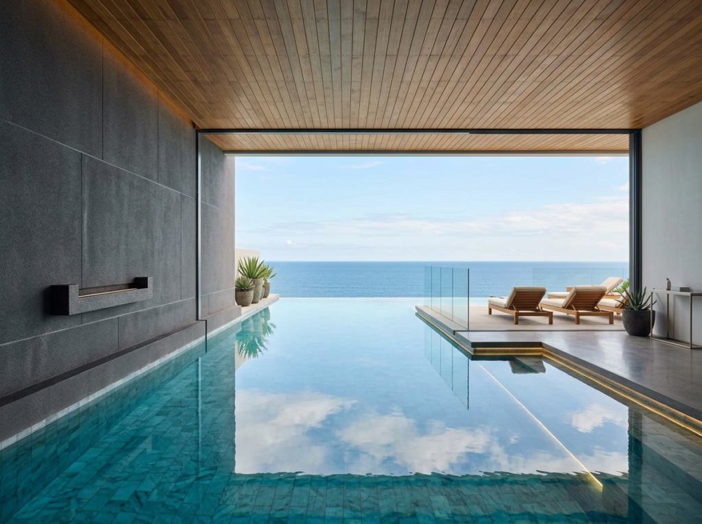 If you have commanding views from high up, you may wish to incorporate a glass wall into your pool. During the construction we will include a rebate to crane in a custom glass panel. Glass wall pools require expert engineering and specialist construction. Lap of Luxury Pools can provide you with advice and guidance including regulatory approval for your glass wall pool.